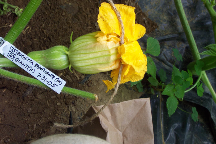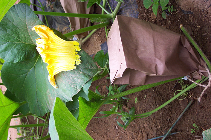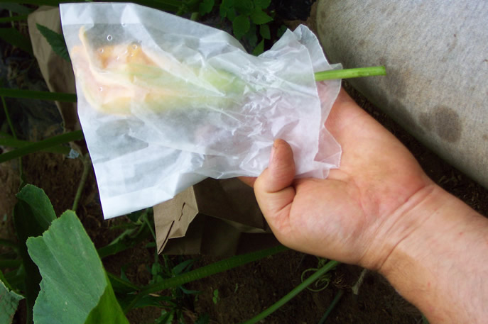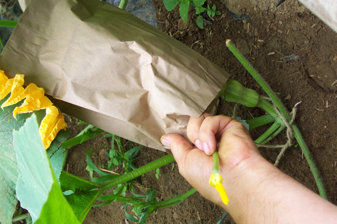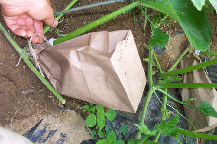 The paper bag is placed back over the female flower to block view of the female flower from polinating insects.
