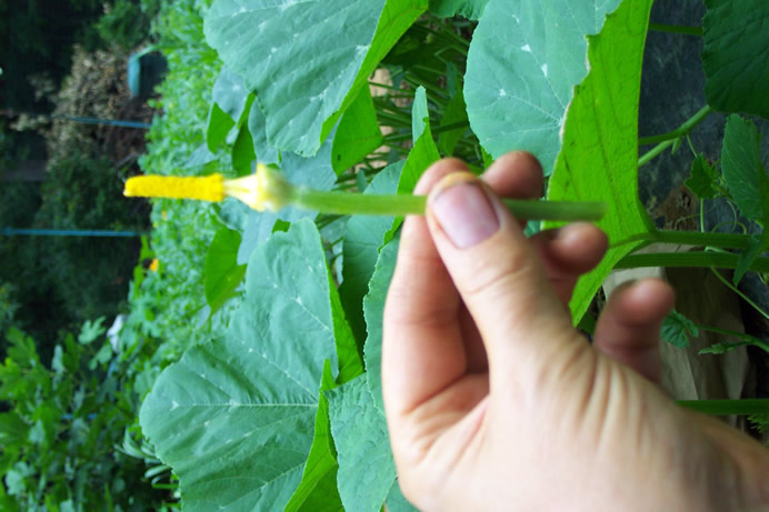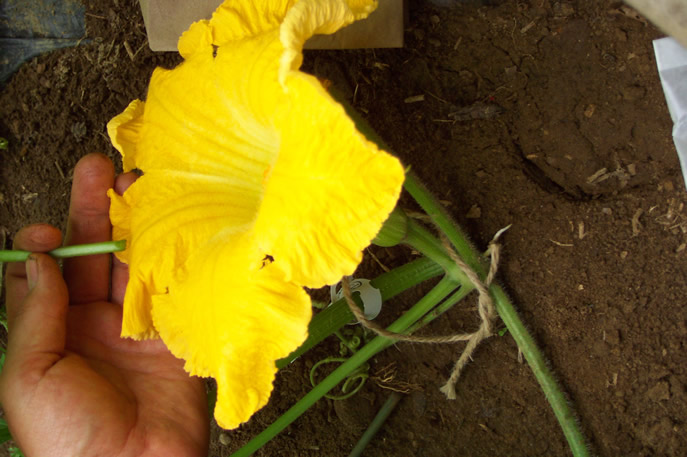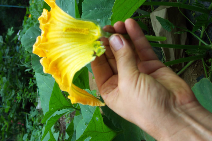 The outer part of the male flower is placed on a squash leaf above and near the bagged female flower before